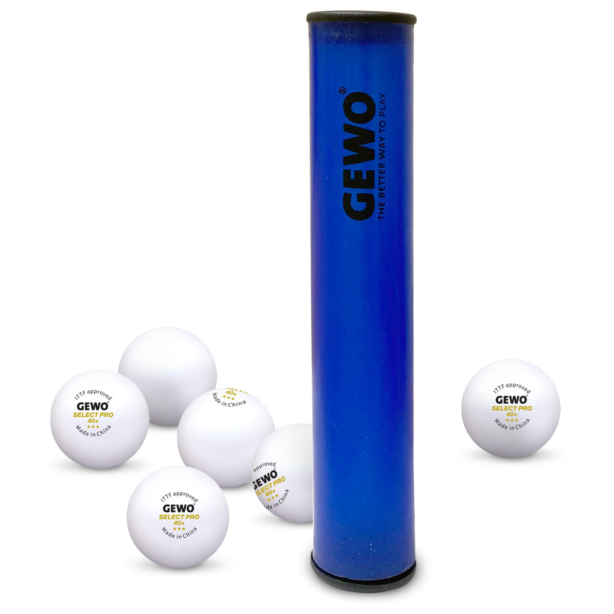 GEWO Ballbox mit 6 GEWO 3-Stern Bällen - Auch als Belag-Andruckrolle verwendbar.