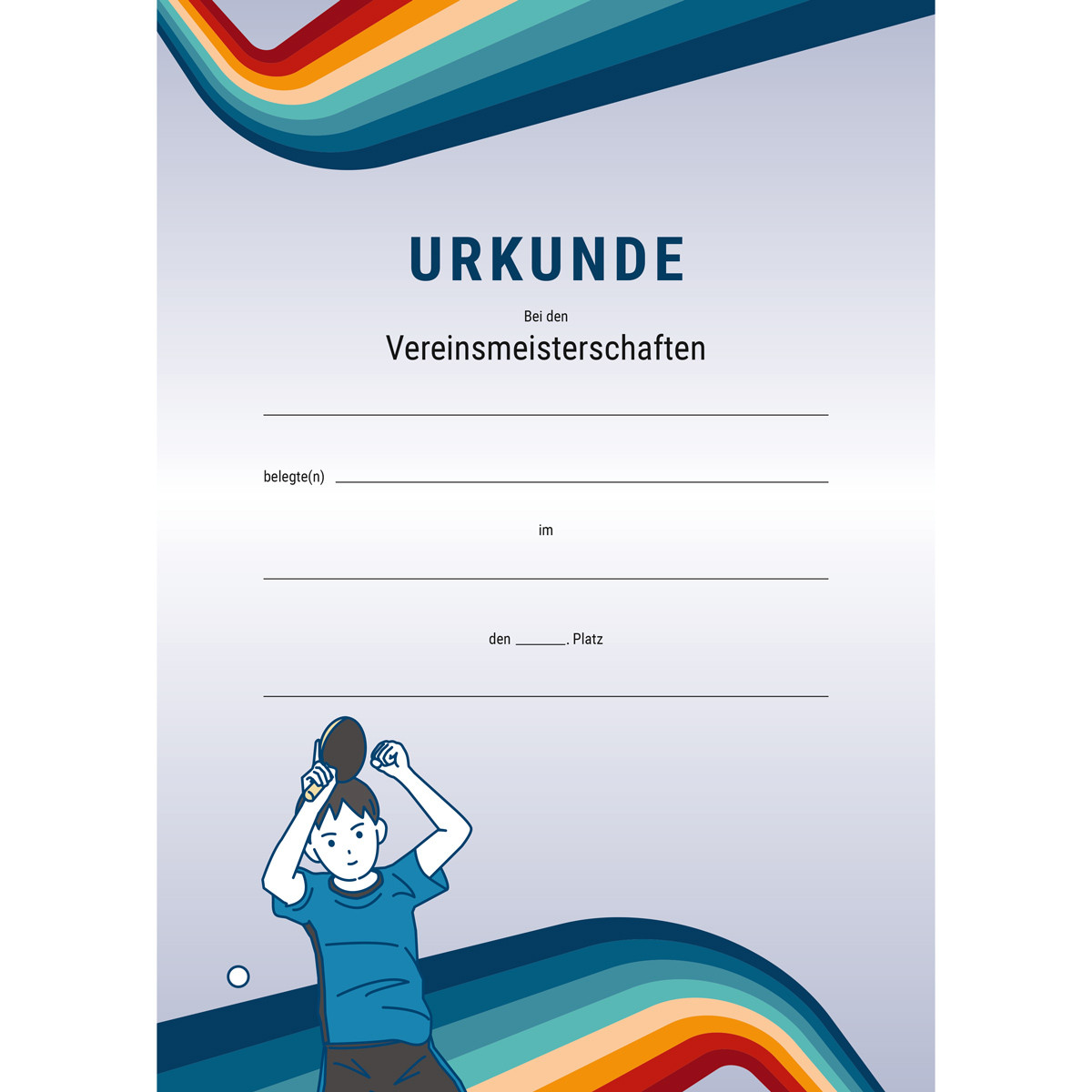 Feier Siege im Tischtennis mit diesen schönen modernen Siegerurkunden. Unsere Urkunden sind zeitgemäß, elegant und szilvoll und sind die perfekt dafür geeignet, Tischtenniserfolge angemessen zu würdigen. Hergestellt aus hochwertigem und festem 250g Karton dokumentieren sie sportliche Leistung mit hoher Qualität.