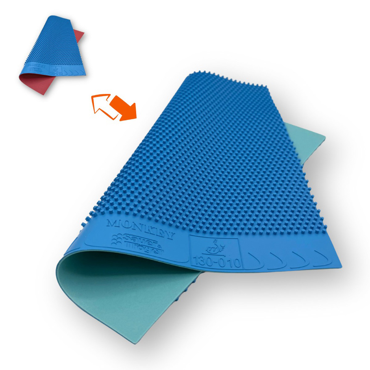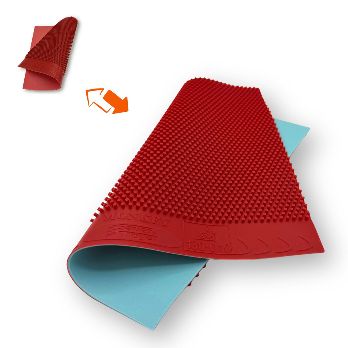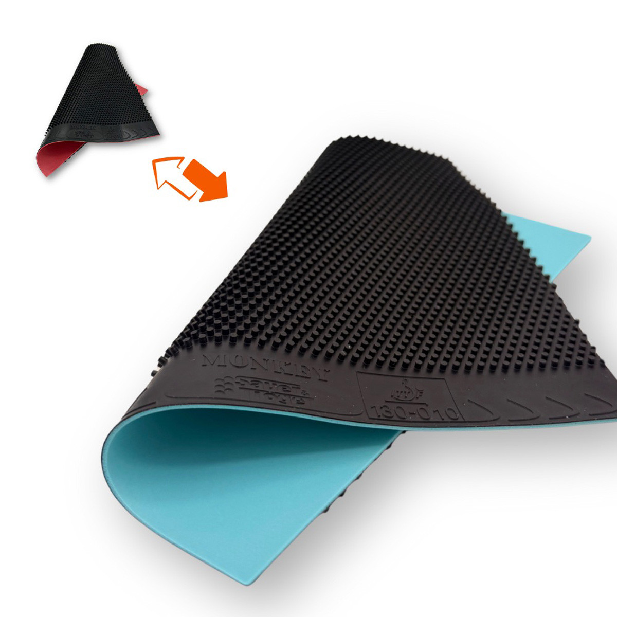 Schwamm Update – ausschließlich 0,6 mm: Die 0,6 mm-Version des Monkey wurde mit einem überarbeiteten und verbesserten Schwamm ausgestattet. Ziel dieser Anpassung ist es, die Konstanz im Ballflug zu erhöhen, sodass jeder Ball mit einer möglichst flachen und gleichmäßigen Flugkurve auf die gegnerische Seite zurückkehrt.