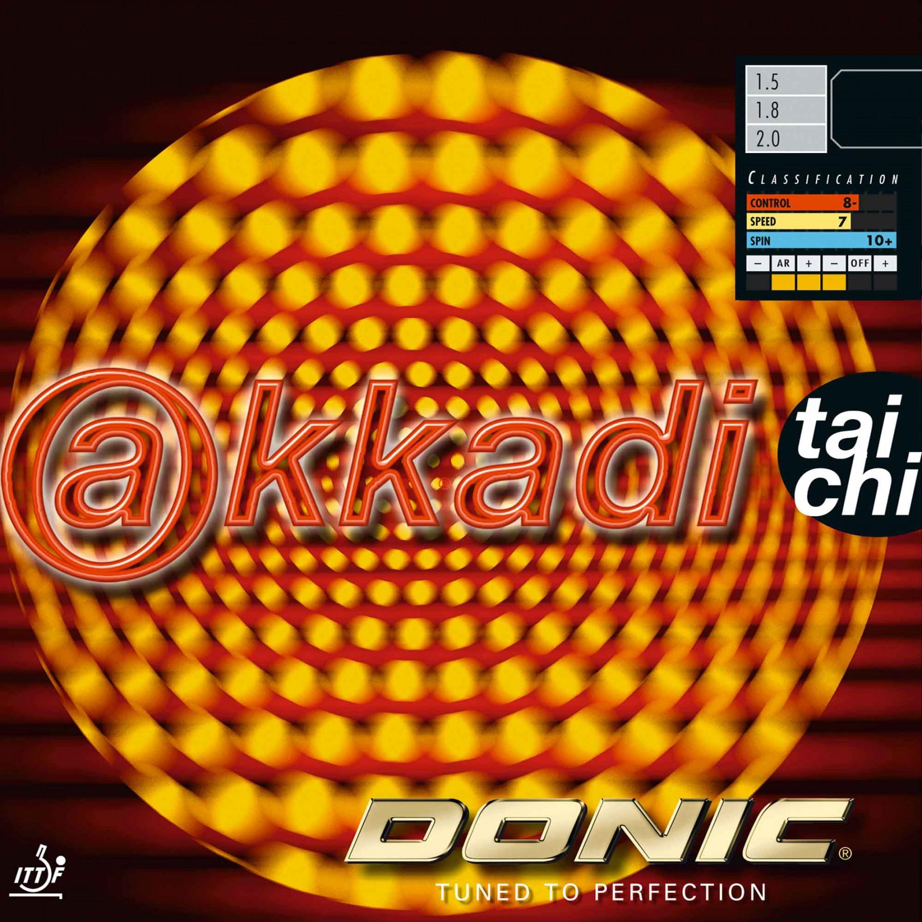 Durch seine klebrig-griffige Oberfläche ermöglicht der DONIC Akkadi TAICHI ein bisher nicht gekanntes Maximum an Schnitt und Rotation. Insbesondere deswegen spielen etliche asiatische Weltklassespieler mit genau dieser Belagmischung in schwarz auf der Vorhandseite. Der schwarze Akkadi TAICHI ist aufgrund seines speziellen schwarzen Untergummis noch etwas härter und direkter ausgelegt als die rote Version. In rot ist der Akkadi TAICHI etwas elastischer und verfügt dank seines japanischen (cremefarbenen) Schwamms über eine noch bessere Ballrückmeldung. Speziell für die Vorhandseite ist die schwarze Version zu empfehlen, da hierdurch ungeahnte Möglichkeiten beim Aufschlag, der Spieleröffnung und dem ersten Topspin entstehen.