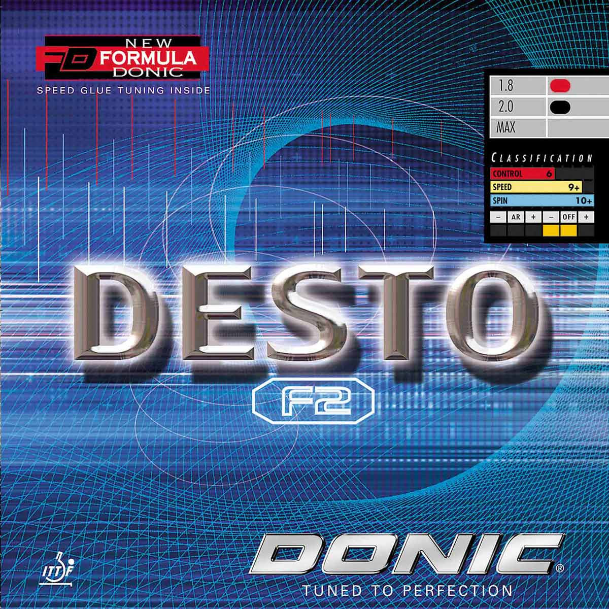 Für die absolute Kontrolle bei sehr hohem Tempo. Der Desto F2 schließt die Lücke zwischen F3 und F1. Er bringt ein deutliches Plus an Schnelligkeit und Spin gegenüber herkömmlichen spinelastischen Belägen und gegenüber dem F3, hat aber nicht ganz die Schnelligkeit des F1. Der Desto F2 ist weich und sehr gefühlvoll, er hat den vollen Sound vom Frischkleben und die faszinierende Spielfreude der Formula Donic.