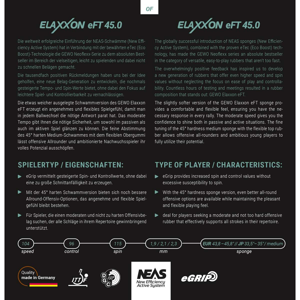 Die weltweit erfolgreiche Einführung der NEAS-Schwämme (New Efficiency Active System) hat in Verbindung mit der bewährten eTec (Eco Boost) - Technologie die GEWO Neoflexx-Serie zu dem absoluten Bestseller im Bereich der vielseitigen, leicht zu spielenden und dabei nicht zu schnellen Belägen gemacht. Die tausendfach positiven Rückmeldungen haben uns bei der Idee geholfen, eine neue Belag-Generation zu entwickeln, die nochmals gesteigerte Tempo- und Spin-Werte bietet, ohne dabei den Fokus auf leichtere Spiel- und Kontrollierbarkeit zu vernachlässigen. Gerade auch jüngere Spieler oder solche, die sich ein wenig mehr Tempo und Variationsmöglichkeiten wünschen, ohne dabei zu hohe Kontrolleinbußen machen zu müssen, können mit den neuen GEWO Elaxxon eFT Varianten glücklich werden.