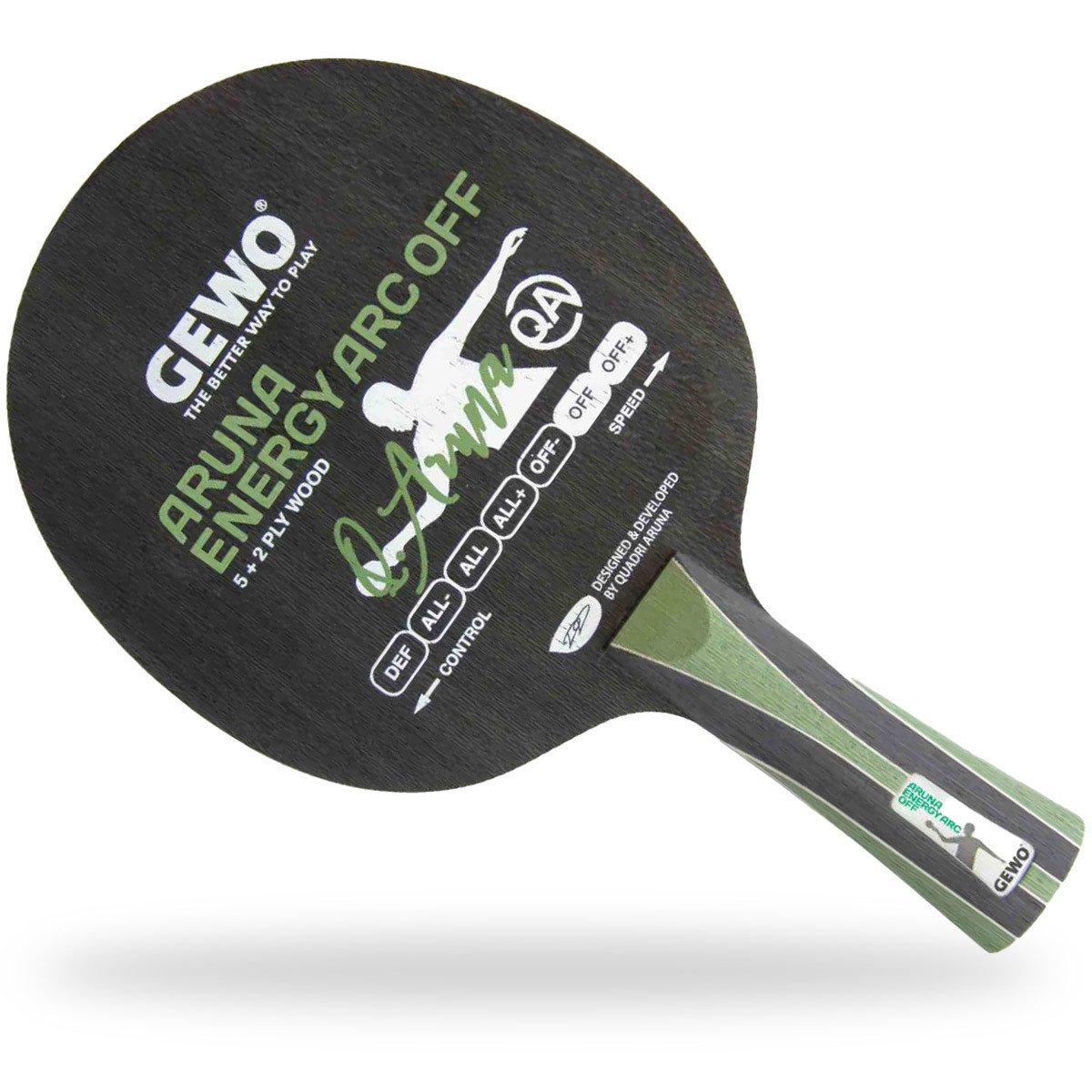 Beim GEWO Aruna Energy ARC OFF wurden 5-Holz und 2-Aramid-Carbonfasern so miteinander verbunden, dass eine ausgewogene Kombination zwischen Tempo, Härte und dem nötigen Gefühl für passive und rotationsreiche Schläge entsteht. Wer also die optimale Balance zwischen Tempo und Kontrolle für das offensive Powertischtennis sucht, ohne dabei Einbußen in puncto Rotationsentwicklung machen zu müssen, kann beim GEWO Aruna Energy ARC fündig werden.
