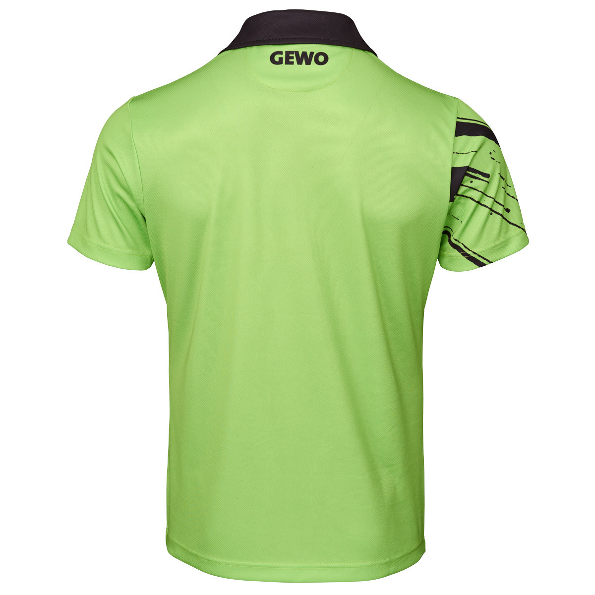 Der linke Ärmel sowie die Rückseite sind bewusst ruhig gehalten, wodurch die grafische Gestaltung der Front besonders hervorgehoben wird. Das GEWO-Logo ist vorne rechts auf der Brust positioniert und wird durch ein weiteres, dezent integriertes Logo im Nackenbereich ergänzt. So entsteht ein harmonisches, markentypisches Gesamtbild mit hohem Wiedererkennungswert auf und neben dem Tischtennistisch.
