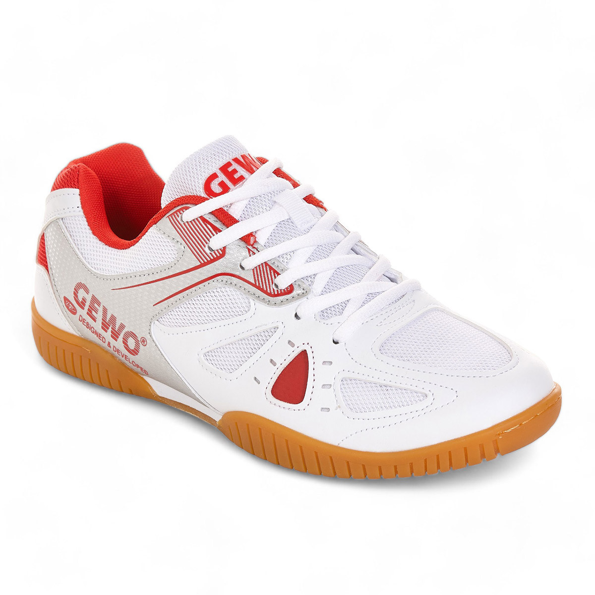 Dieser nur für Tischtennis entwickelte Schuh von GEWO zeichnet sich durch durchdachte Konstruktion aus. Im Vergleich zu herkömmlichen Hallenschuhen überzeugen die Schuhe mit ihrem hervorragenden Preis-Leistungs-Verhältnis. Die Sohle ist eine klassische, strapazierfähige und rutschfeste Indoorsohle, die sich inzwischen millionenfach bewährt hat. Der Oberschuh ist eine gelungene Kombination aus komfortablem Material, das luftdurchlässig ist und geschicktem Schnitt, der ausreichend viel Stabilität durch klug verstärkte Schuhpartien bietet. Der Oberschuh ist aus Mesh-Material gefertigt und wird rundherum mit Kunstleder verstärkt, um dem Spieler eine optimale Stabilität zu bieten. Die Eigenschaften des Schuhs ermöglichen es dem Spieler, sich schnell und wendig am Tischtennistisch zu bewegen, ohne den Halt zu verlieren. Das geringe Schuhgewicht verleiht dem Spieler zusätzliche Geschwindigkeit und Wendigkeit während des Spiels.