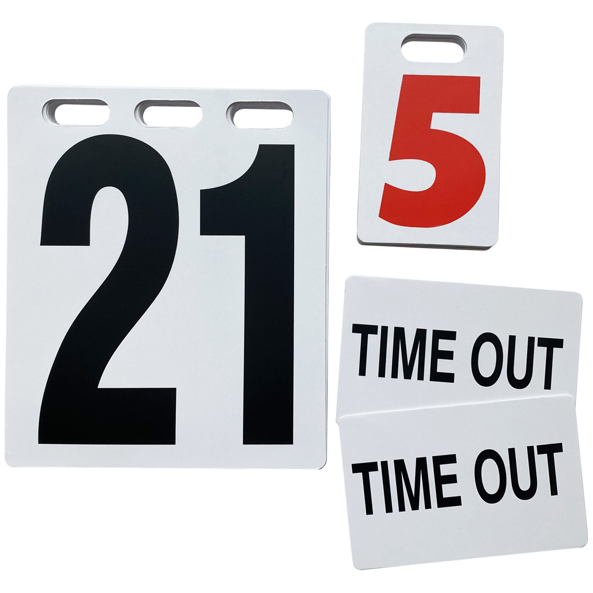 Inhalt: Zwei Sätze große Nummern für die Punktanzeige von 0 bis 21 und zweimal kleine Nummern für die Anzeige der Sätze von 0 bis 5. Außerdem enthalten sind zwei Time Out Karten