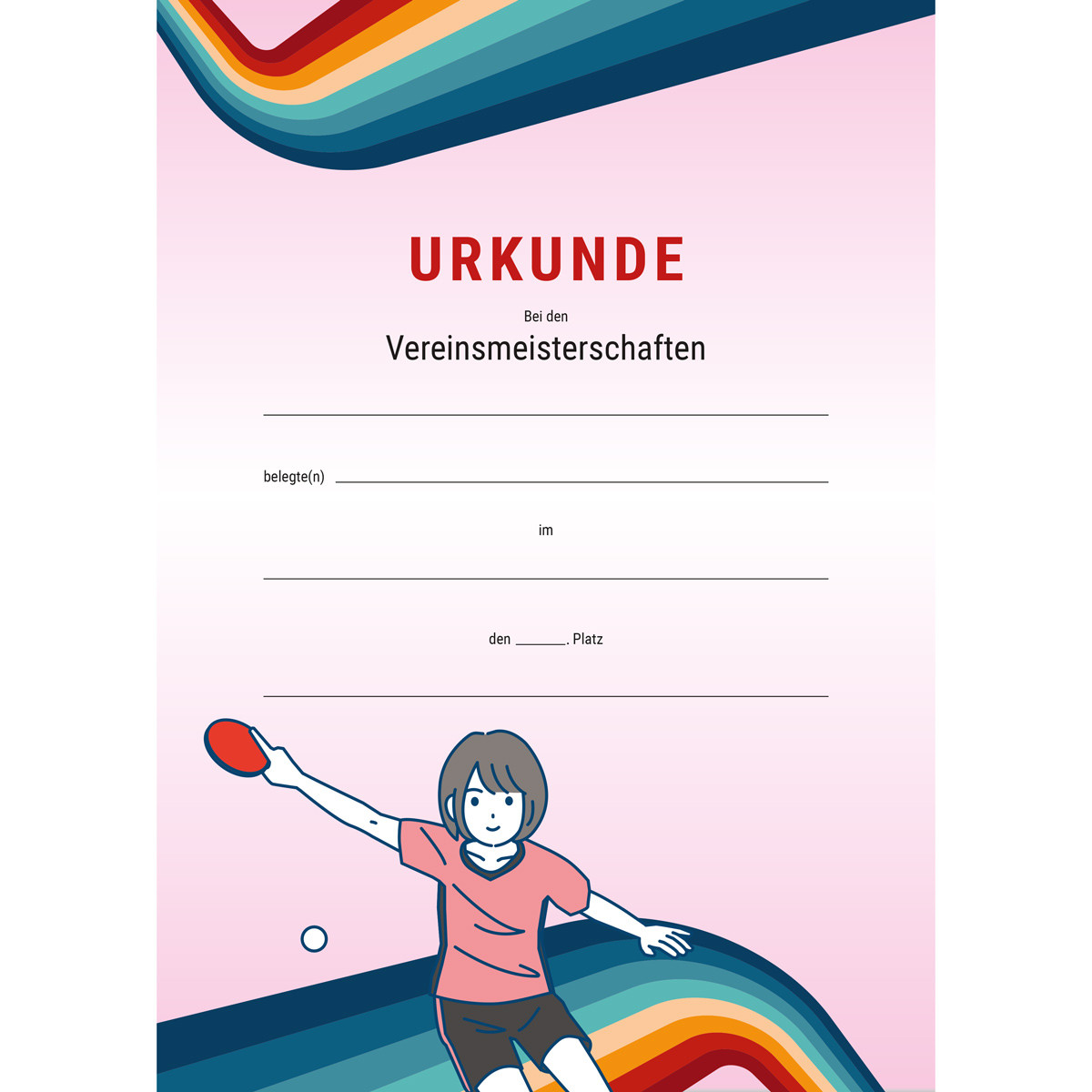 Urkunde Motiv Kinder / Mädchen. Die Urkunde ist mit zwei Retro-Farbbanderolen und einer Illustration im Mangastil, mit einem Mädchen das Tiscchtennis spielt, kindgerecht gestaltet. Die Urkunde ist mit einem Eindruck ausgestattet und kann handschriftlich ausgefüllt werden.